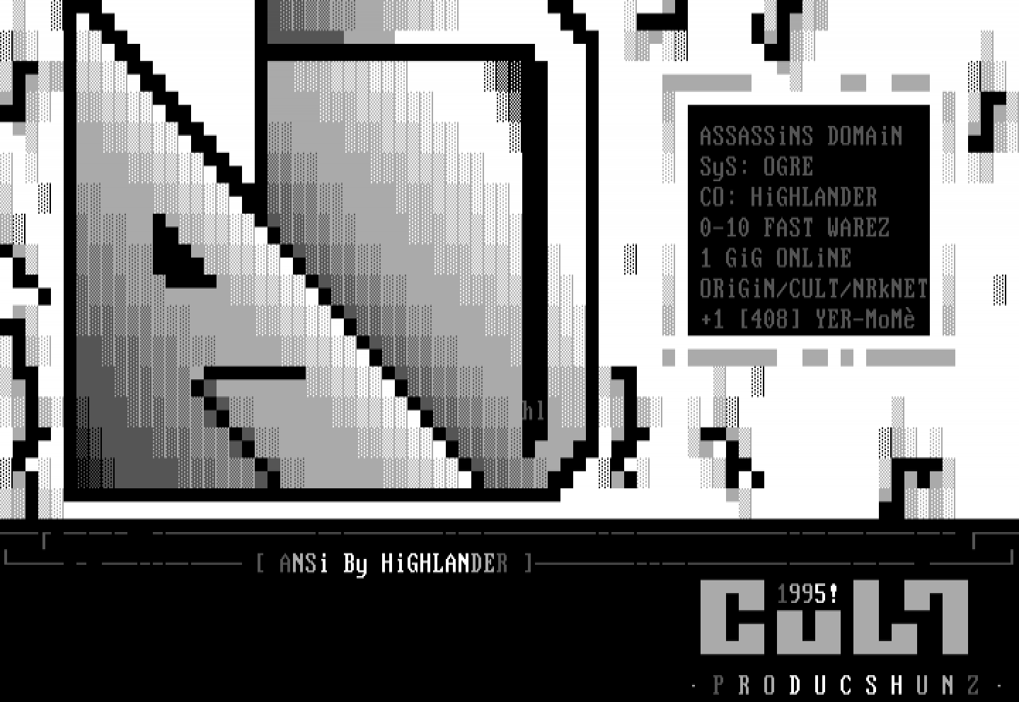 ASSASSiNS DOMAiN SyS: OGRE CO: HiGHLANDER 0-10 FAST WAREZ 1 GiG ONLiNE ORiGiN/CULT/NRkNET +1 408 YER-MoM hl -- --------------- - ---- ANSi By HiGHLANDER -------- 1995!