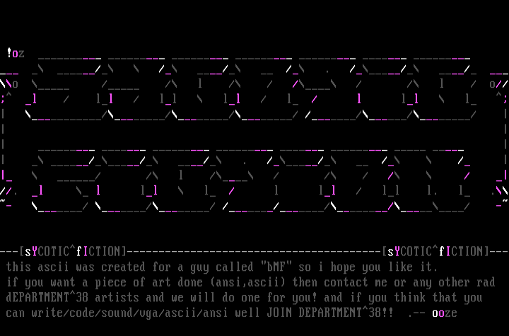 can write/code/sound/vga/ascii/ansi well JOIN DEPARTMENT38!! .-- ooze