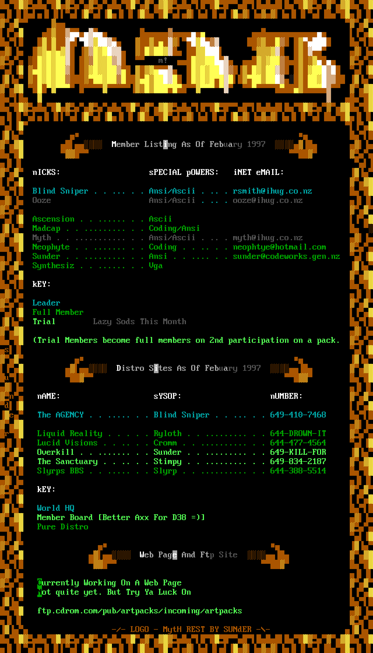 Madcap . . ......... . . Coding/Ansi Myth . . ........... . . Ansi/Ascii . .. . myth@ihug.co.nz Neophyte . . ....... . . Coding . . .. . . neophtye@hotmail.com Sunder . . ......... . . Ansi . . .... . . sunder@codeworks.gen.nz