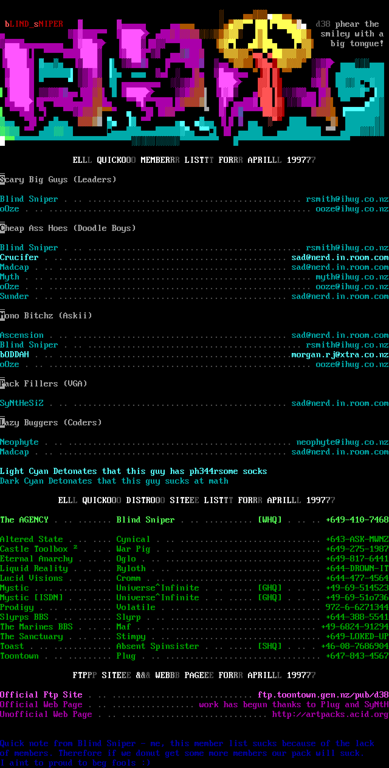 Blind Sniper . .. ............................................ rsmith@ihug.co.nzCrucifer . .. ............................................. sad@nerd.in.room.comMadcap . .. ............................................... sad@nerd.in.room.comMyth . .. ...................................................... myth@ihug.co.nzoOze . .. ...................................................... ooze@ihug.co.nzSunder . .. ............................................... sad@nerd.in.room.com
