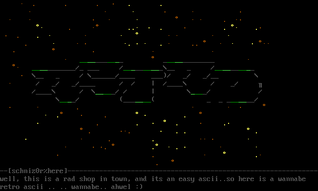 --schniz0rhere---------------------------------------------------------------well, this is a rad shop in town, and its an easy ascii..so here is a wannabe