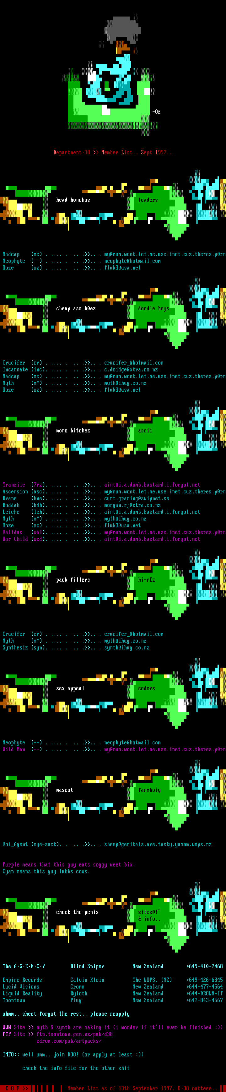 Crucifer cr . .... . .. ... . crucifer@hotmail.com Incarnate inc. .... . .. ... . c.doidge@xtra.co.nz Madcap mc . .... . .. ... . my@mum.wont.let.me.use.inet.cuz.theres.p0rn Myth m! . .... . .. ... . myth@ihug.co.nz Ooze oz . .... . .. ... . fluk3@usa.net