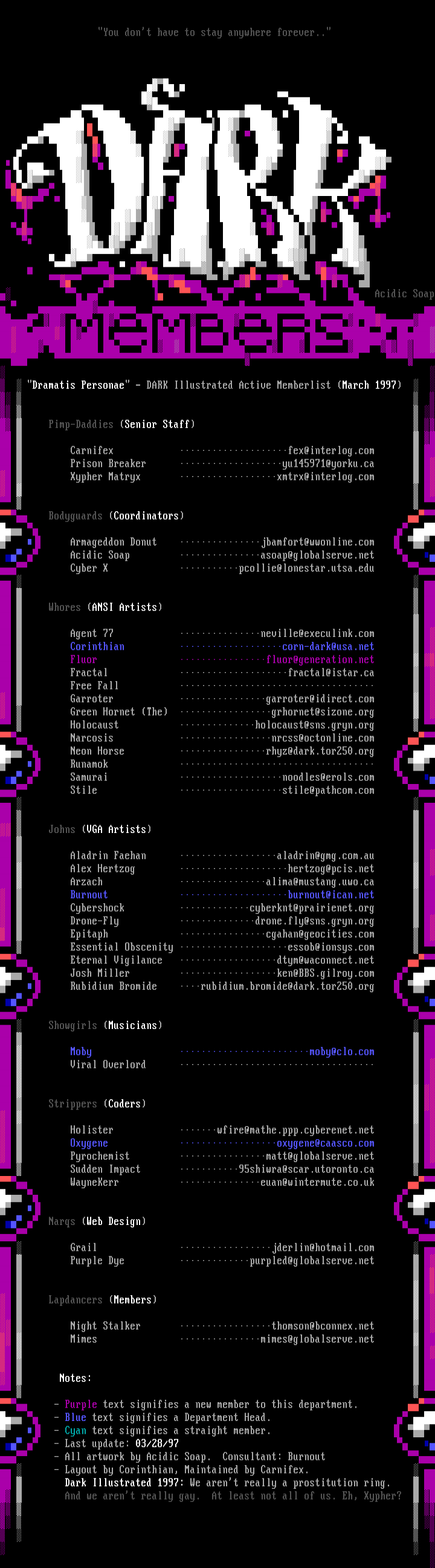 - Purple text signifies a new member to this department. - Blue text signifies a Department Head. - Cyan text signifies a straight member. - Last update: 03/28/97 - All artwork by Acidic Soap. Consultant: Burnout - Layout by Corinthian, Maintained by Carnifex. Dark Illustrated 1997: We arent really a prostitution ring.