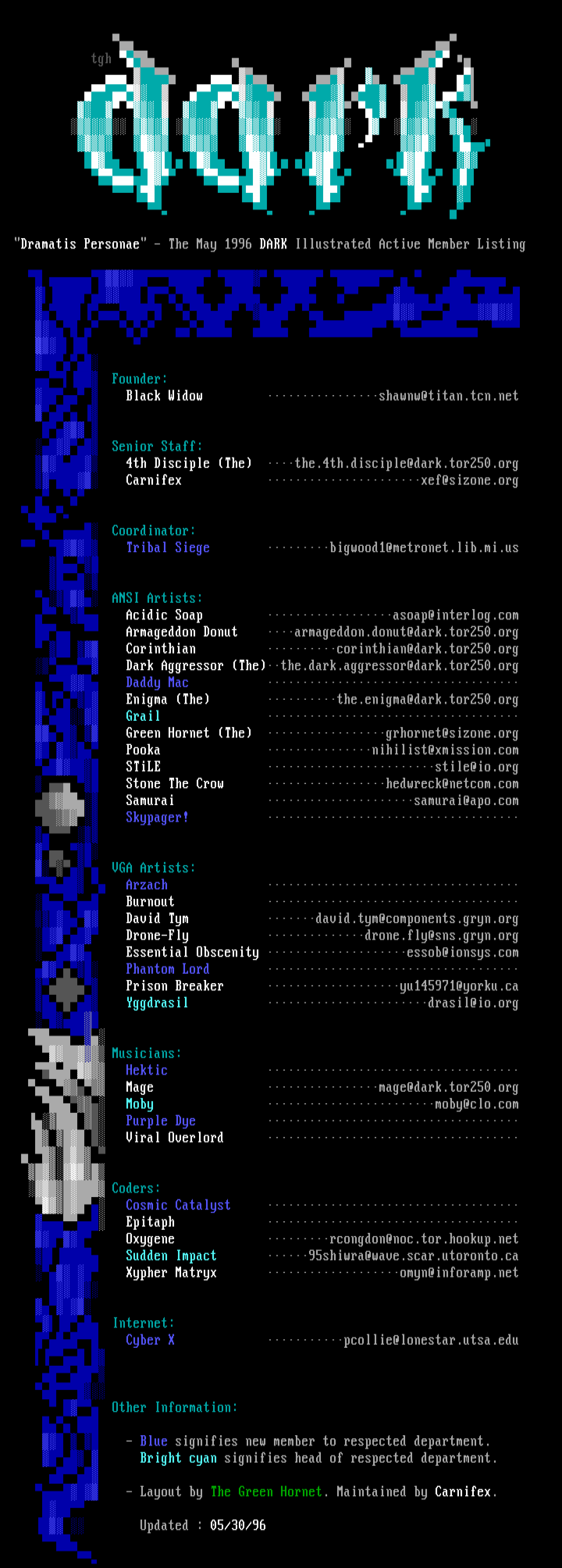 Dramatis Personae - The May 1996 DARK Illustrated Active Member Listing