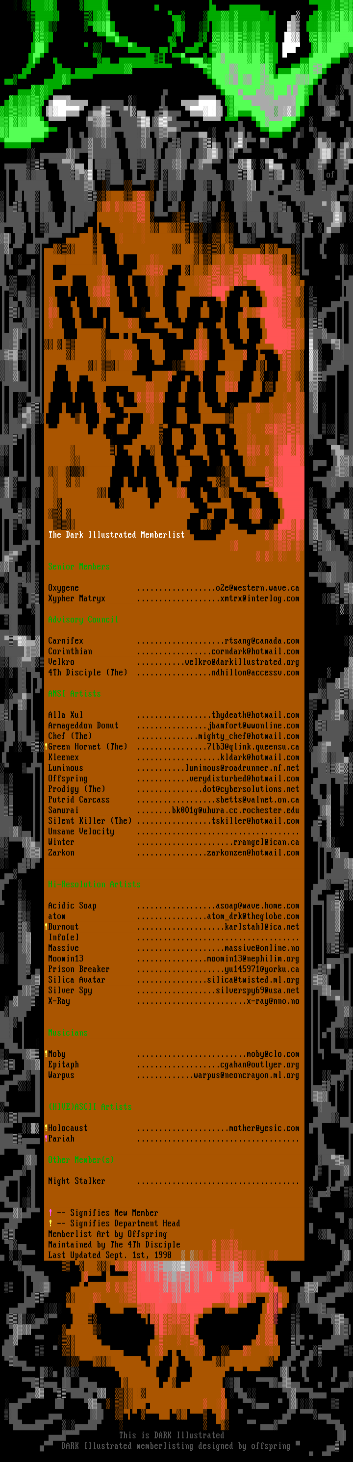 !Moby .........................moby@clo.com Epitaph ...................cgahan@outlyer.org Warpus .............warpus@neoncrayon.ml.org HIVEASCII Artists !Holocaust .....................mother@yesic.com !Pariah..................................... Other Members Night Stalker ..................................... !--Signifies New Member !-- Signifies Department Head Memberlist Art by Offspring Maintained by The 4Th Disciple