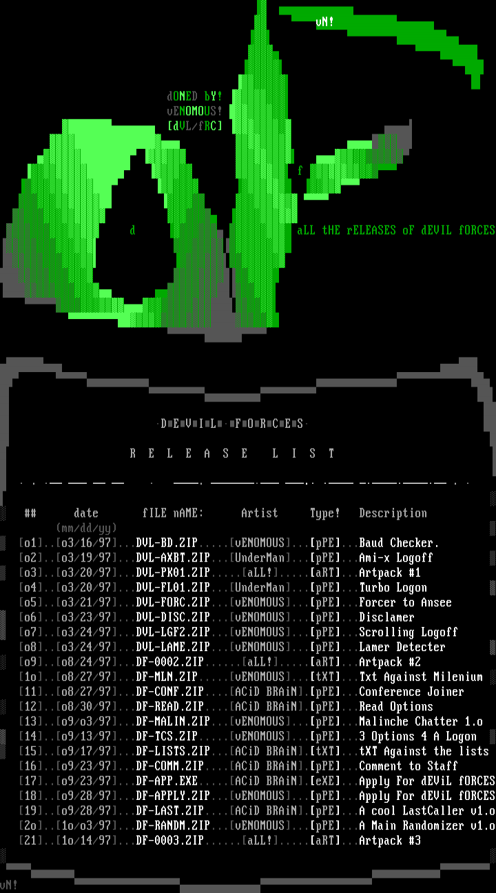 17..o9/23/97...DF-APP.EXE.....ACiD BRAiN.eXE...Apply For dEViL fORCES 18..o9/28/97...DF-APPLY.ZIP...vENOMOUS...pPE...Apply For dEViL fORCES 19..o9/28/97...DF-LAST.ZIP....ACiD BRAiN.pPE...A cool LastCaller v1.o 2o..1o/o3/97...DF-RANDM.ZIP...vENOMOUS...pPE...A Main Randomizer v1.o 21..1o/14/97...DF-0003.ZIP......aLL!.....aRT...Artpack 3