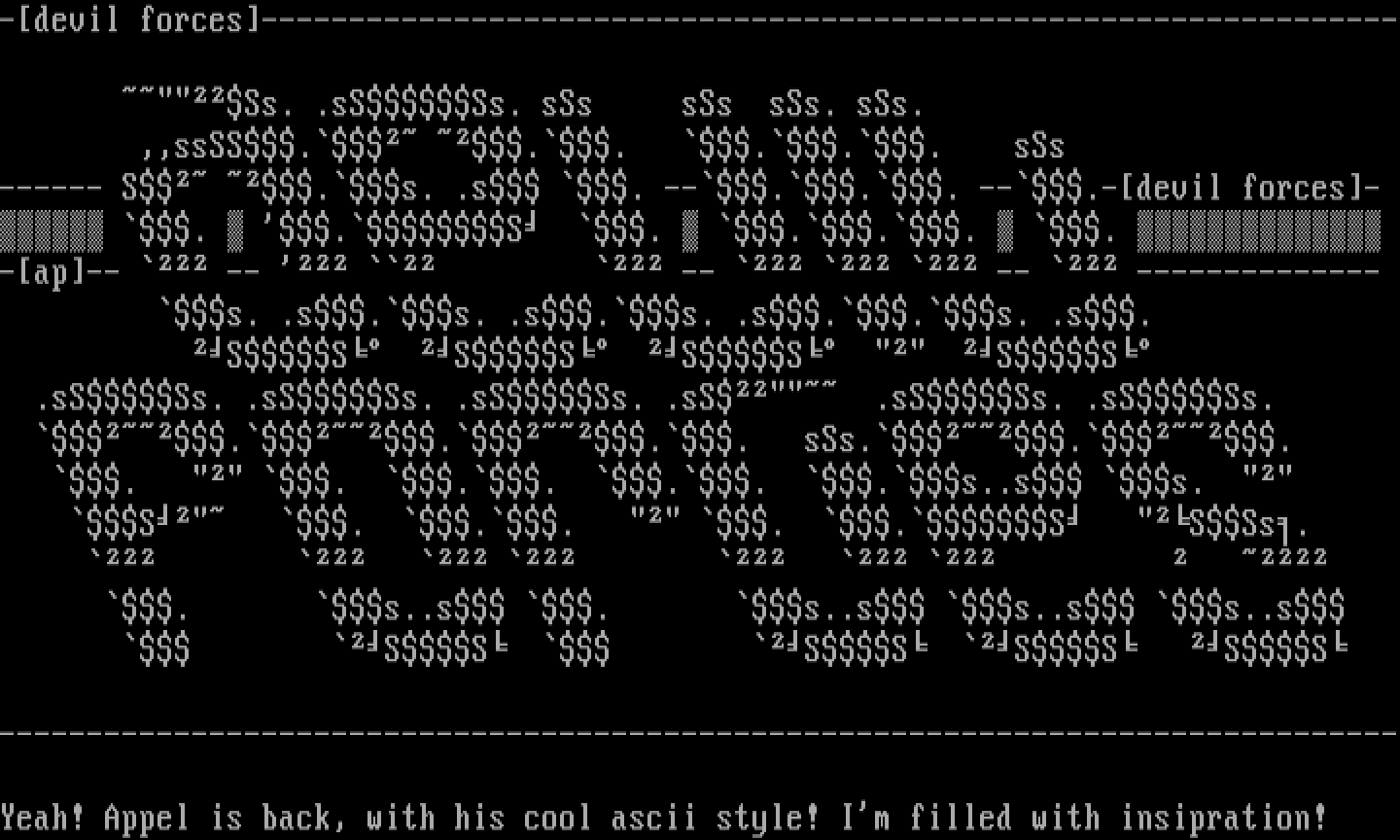 Yeah! Appel is back, with his cool ascii style! Im filled with insipration!