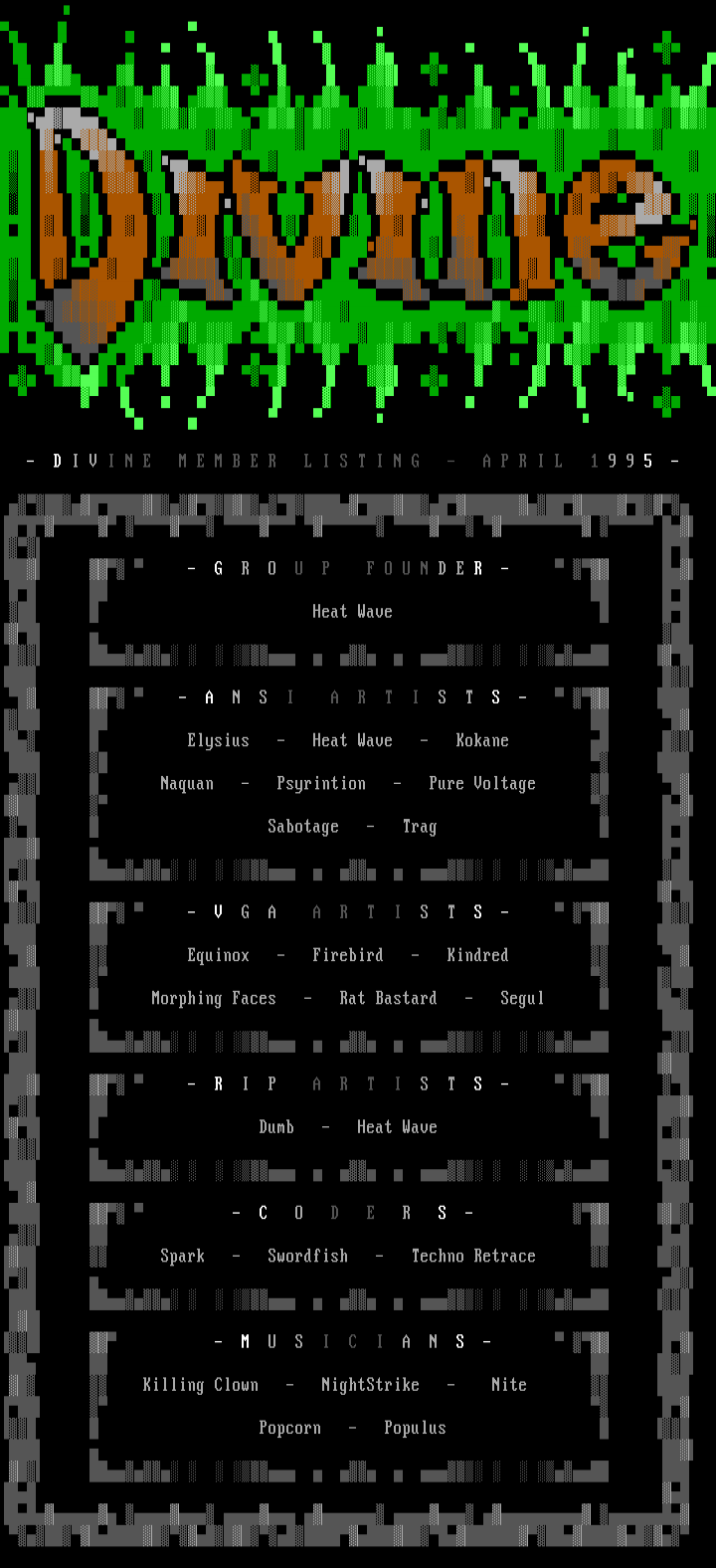 -DIVINEMEMBERLISTING-APRIL1995--GROUPFOUNDER-HeatWave-ANSIARTISTS-Elysius-HeatWave-KokaneNaquan-Psyrintion-PureVoltageSabotage-Trag-VGAARTISTS-Equinox-Firebird-KindredMorphingFaces-RatBastard-Segul-RIPARTISTS-Dumb-HeatWave-CODERS-Spark-Swordfish-TechnoRetrace-MUSICIANS-KillingClown-NightStrike-NitePopcorn-Populus