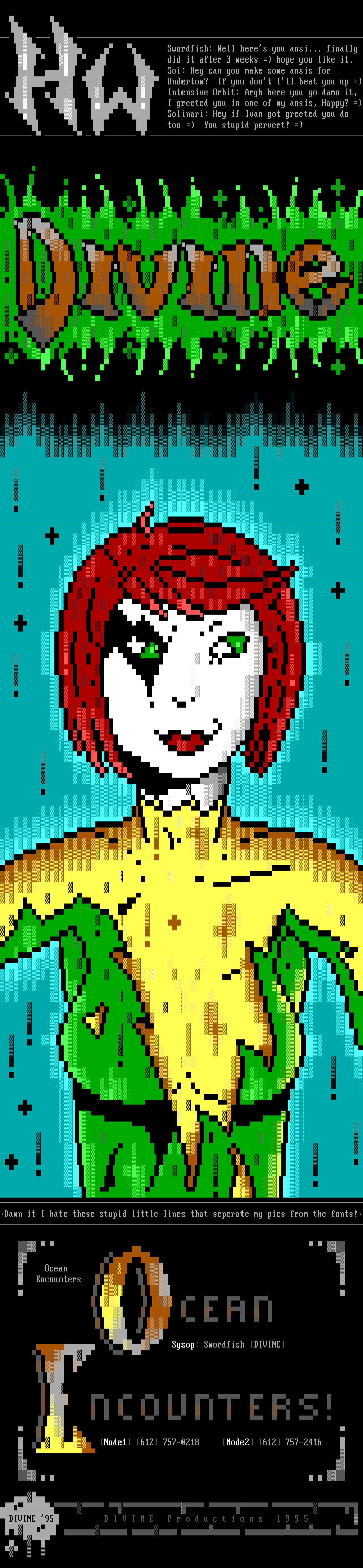 DamnitIhatethesestupidlittlelinesthatseperatemypicsfromthefonts!OceanEncounters Sysop:SwordfishDIVINENode1612757-0218Node2612757-2416DIVINE 95DIVINEProductions1995