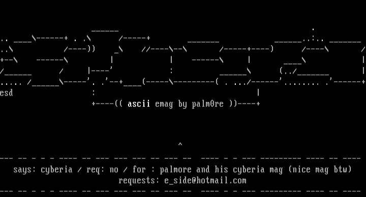 says: cyberia / req: no / for : palmore and his cyberia mag nice mag btw