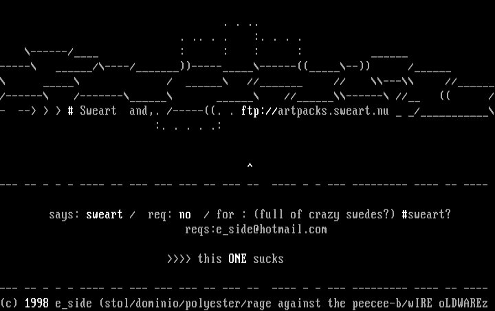 ----- /----/------------- / / // // --- ------ /------- //------ // /- -- Sweart and,. /-----. . ftp://artpacks.sweart.nu / :. . . . .:
