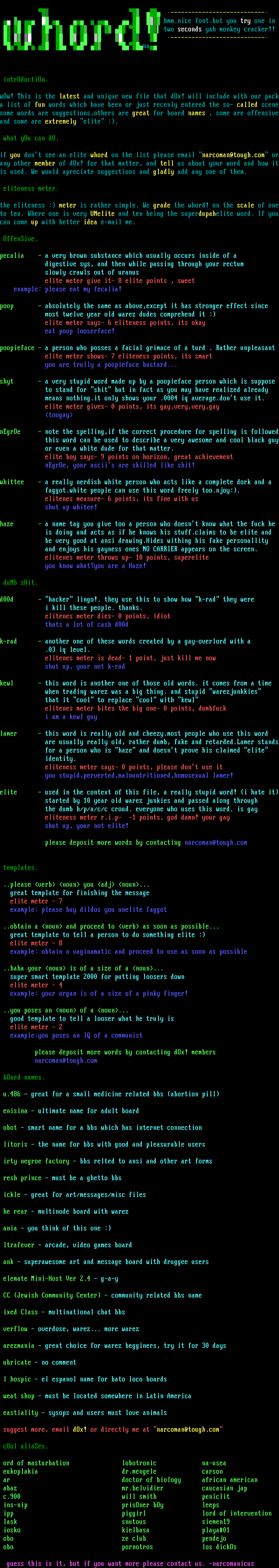 if you dont see an elite whord on the list please email narcoman@tough.com orany other member of dOx! for that matter, and tell us about your word and how itis used. We would apreciate suggestions and gladly add any one of them.