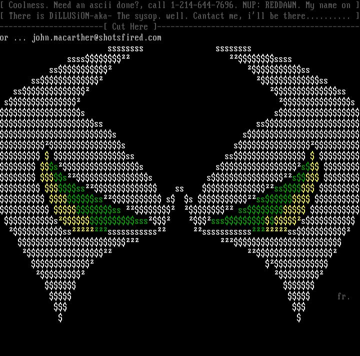 Coolness. Need an ascii done?, call 1-214-644-7696. NUP: REDDAWN. My name on There is DiLLUSiON-aka- The sysop. well. Cantact me, ill be there.......... ----------------------- Cut Here ---------------------------------------------or ... john.macarther@shotsfired.com