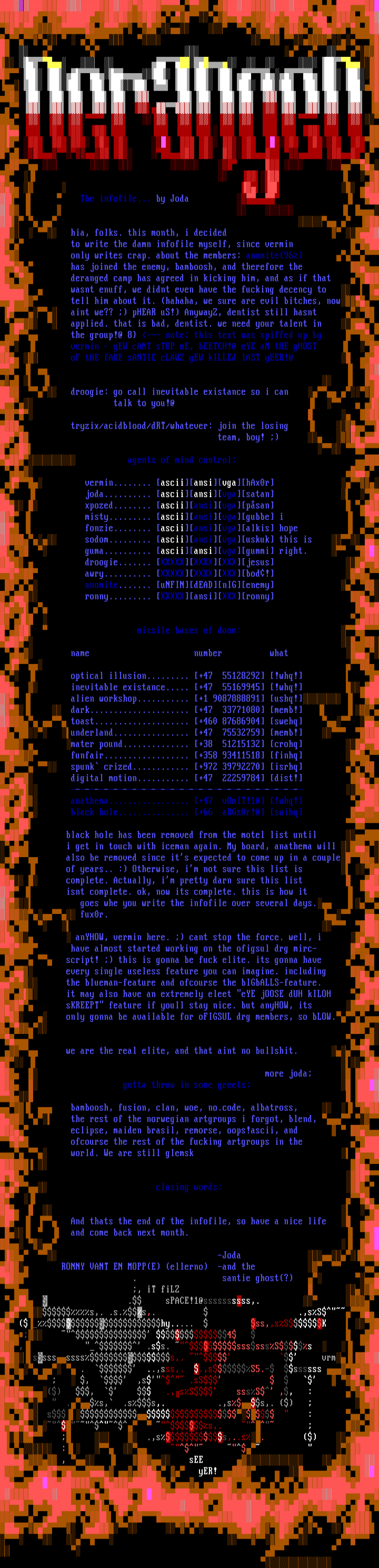 the rest of the norwegian artgroups i forgot, blend, eclipse, maiden brasil, remorse, oops!ascii, and ofcourse the rest of the fucking artgroups in the