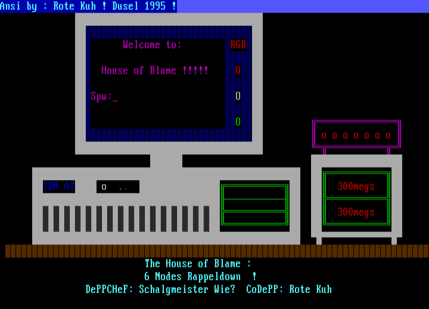 Ansi by : Rote Kuh ! Dusel 1995 ! Welcome to: RGB House of Blame !!!!! O Spw: O O o o o o o o o IBM AT o .. 300megs