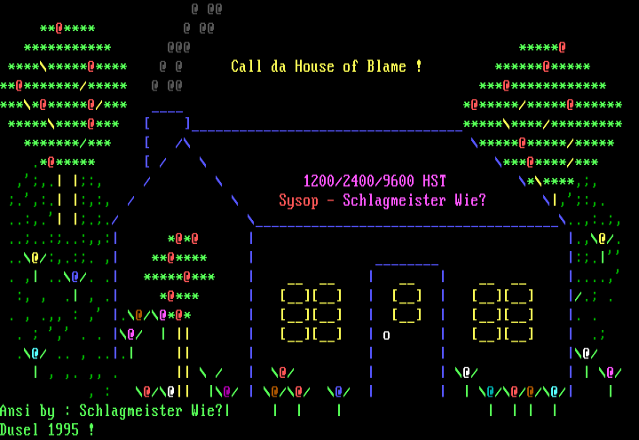 @ @@ **@**** @ @@ *********** @@@ *****@ *********@**** @ @ Call da House of Blame ! ******@***** **@*******/***** @ @@ ***@************ ****@*****@/*** *@*****/*****@****** *********@*** *********/********* *******/*** / *****@*****/***** .*@***** / ***@****/*** ,,. :, / 1200/2400/9600 HST *****,, .,:. :,:, / Sysop - Schlagmeister Wie? ,:,. ..:,. ../ ..,:., ....:..:,,: *@*@ .,@/. ..@/:,.:. , **@**** :. . , ..@/. . *****@*** ...., :, , . , . *@*** /. . . , .,, : , .@/@*@* . . . , . . @/ o . .@/ .. , ... @/ , ,. ,, . / @/ @/ @/ , : @/@ @/ @/@/ @/ @/@/@/@/ Ansi by : Schlagmeister Wie? Dusel 1995 !