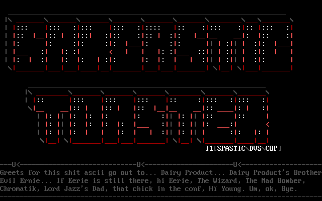 ---8-----------------------------8----------------------8--------------------Greets for this shit ascii go out to... Dairy Product... Dairy Products BrotherEvil Ernie... If Eerie is still there, hi Eerie, The Wizard, The Mad Bomber,