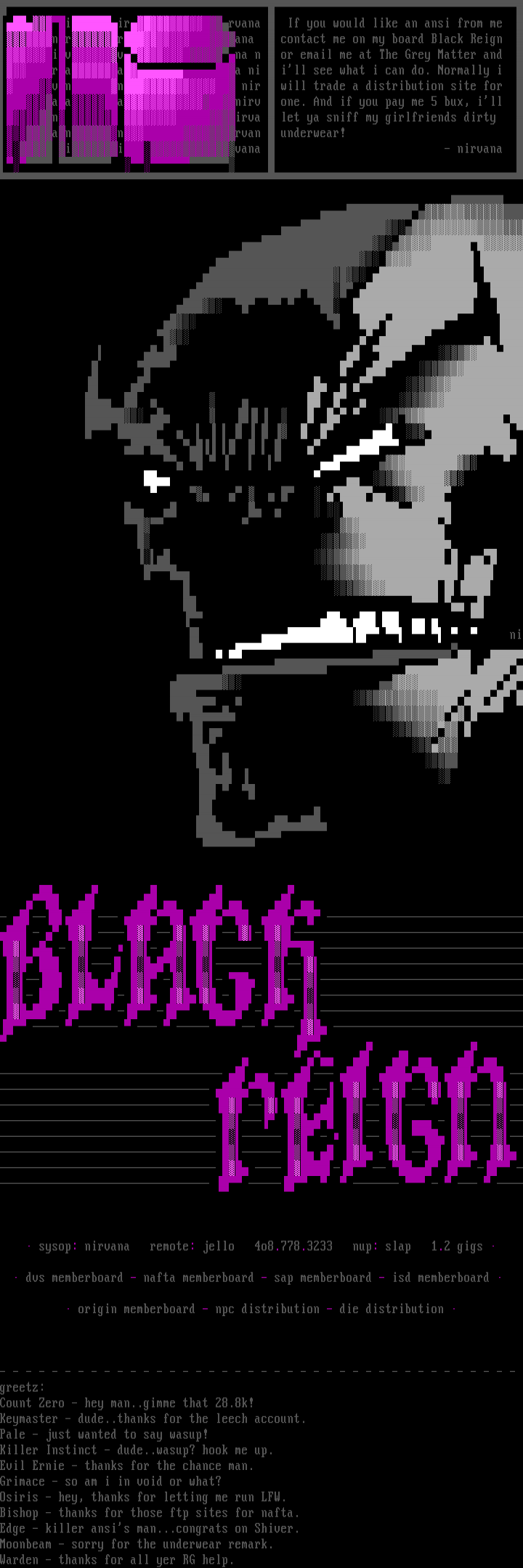iirrvana If you would like an ansi from me nrrana contact me on my board Black Reign ivvna n or email me at The Grey Matter and raaa ni ill see what i can do. Normally i vnn nir will trade a distribution site for aaanirv one. And if you pay me 5 bux, ill n irva let ya sniff my girlfriends dirty annrvan underwear! iivana - nirvana