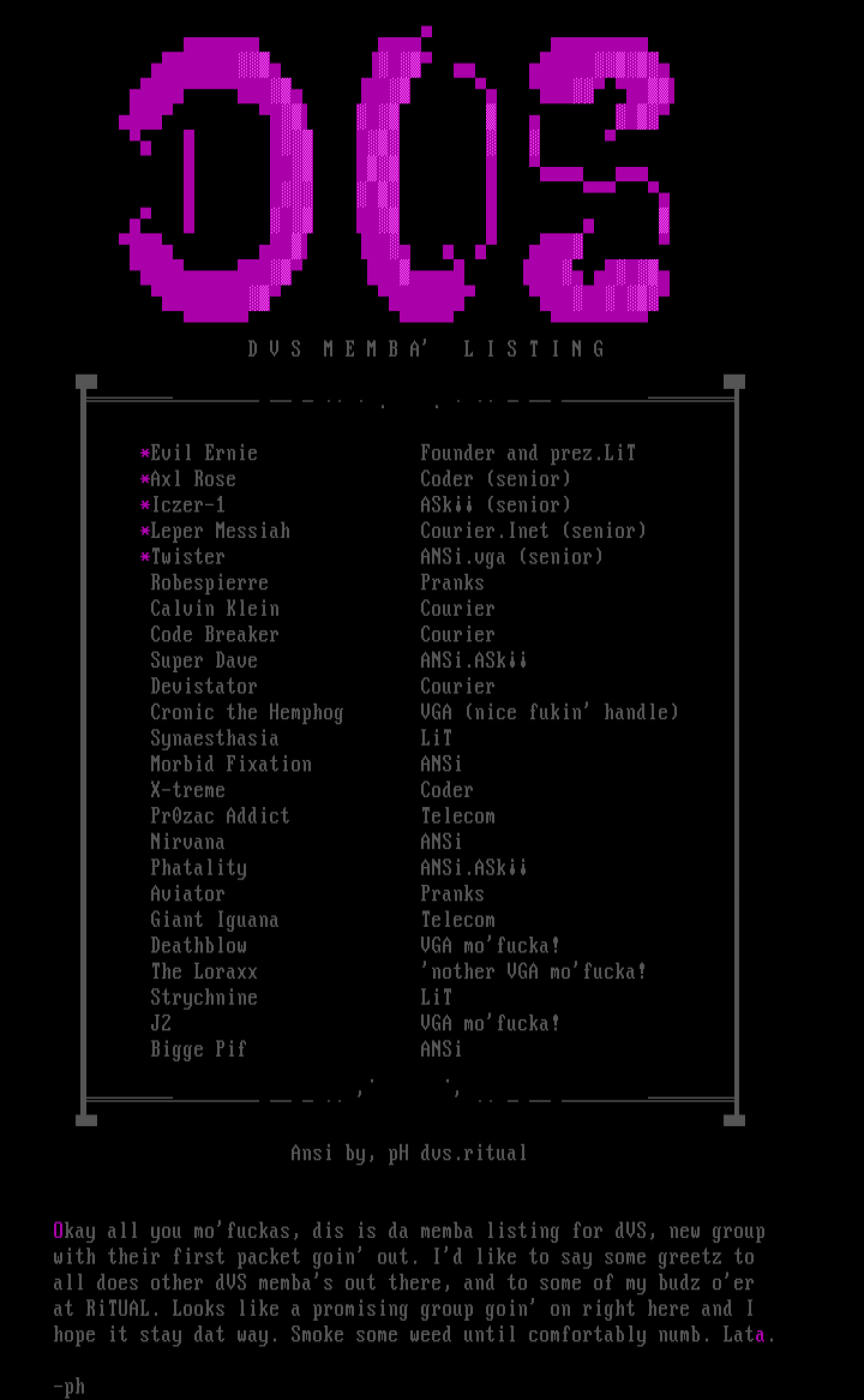 Okay all you mofuckas, dis is da memba listing for dVS, ne