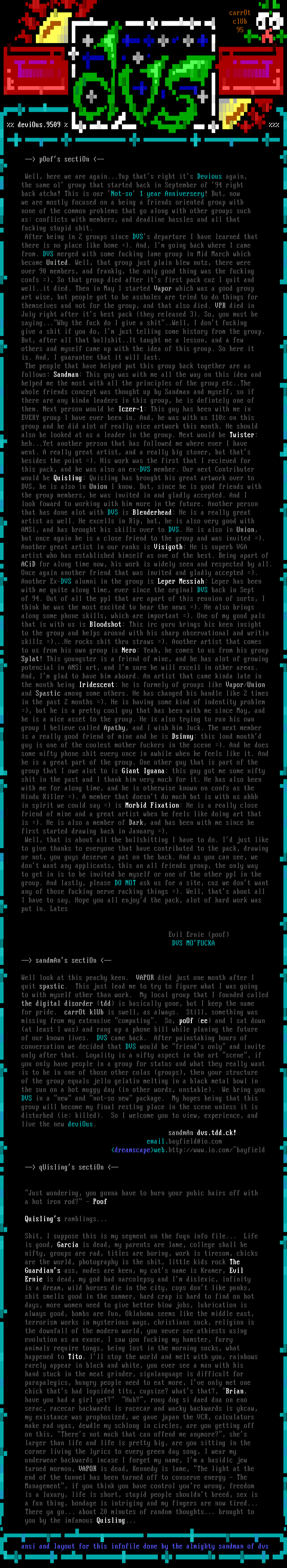DVS, he is also in Union I know. But, since he is good friends with the group members, he was invited in and gladly accepted. And I look foward to working with him more in the future. Another person that has done alot with DVS is Blenderhead: He is a really great artist as well. He excells in Rip, but, he is also very good with ANSi, and has brought his skills over to DVS. He is also in Union, but once again he is a close friend to the group and was invited . Another great artist in our ranks is Visigoth: He is superb VGA artist who has established himself as one of the best. Being apart of ACiD for along time now, his work is widely seen and respected by all. Once again another friend that was invited and gladly accepted . Another Ex-DVS alumni in the group is Leper Messiah: Leper has been with me quite along time, ever since the orginal DVS back in Sept of 94. Out of all the ppl that are apart of this reunion of sorts, I think he was the most excited to hear the news . He also brings