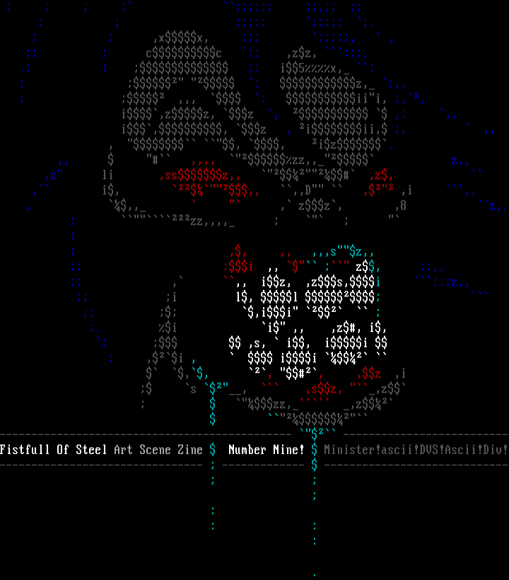 ---------------------------------------------- --------------------------Fistfull Of Steel Art Scene Zine Number Nine! Minister!ascii!DVS!Ascii!Div!-------------------------------- ------------- -----------------------------