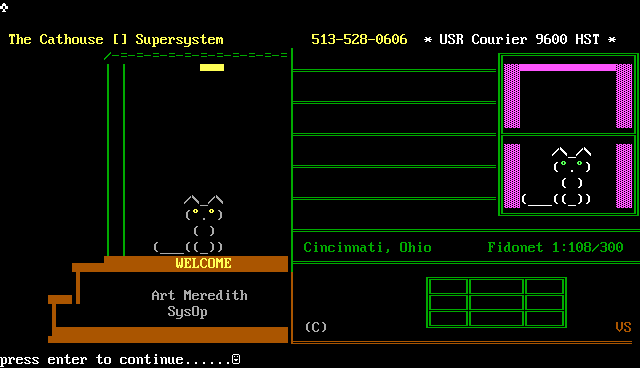 TheCathouseSupersystem 513-528-0606 *USRCourier9600HST*-----------/ // . // . 003/801:1tenodiFoihO,itannicniC WELCOME ArtMeredith pOsySC VSpressentertocontinue......