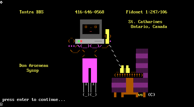 TantraBBS 416-646-0568 Fidonet1:247/106 St.CatharinesadanaC,oiratnO. - + +++/ / / uaenesrAnoDSysop !!!!!!!!!! Csvpressentertocontinue...