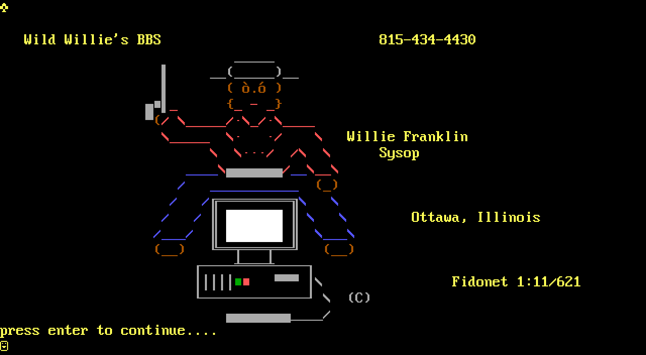 WildWilliesBBS 815-434-4430 . - / WillieFranklinposyS / sionillI,awattO 126/11:1tenodiF C/pressentertocontinue....