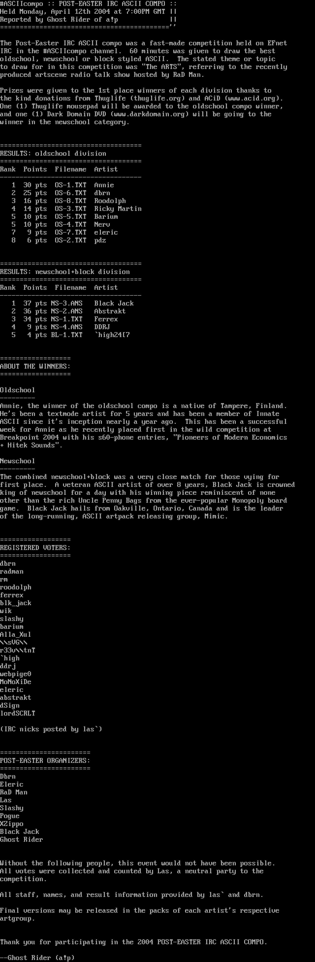Thank you for participating in the 2004 POST-EASTER IRC ASCII COMPO.