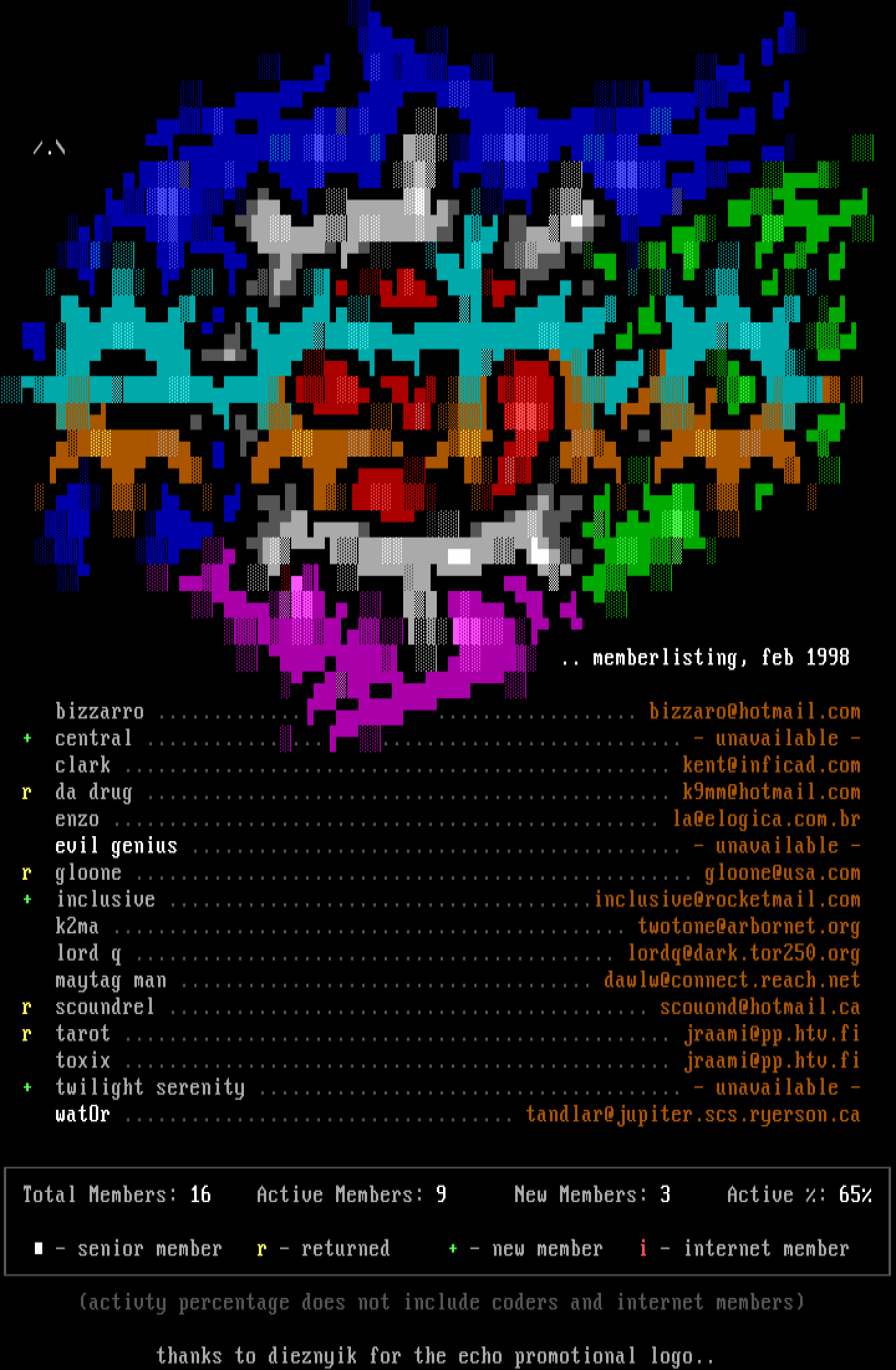 Total Members: 16 Active Members: 9 New Members: 3 Active : 65 xx - senior member r - returned + - new member i - internet member x activty percentage does not include coders and internet members