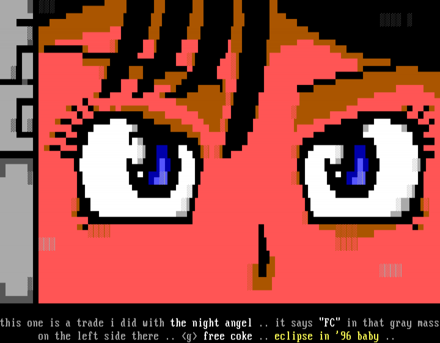this one is a trade i did with the night angel .. it says FC in that gray mass on the left side there .. g free coke .. eclipse in 96 baby ..