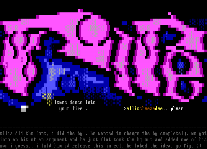 --------------------------------------------------------------------------------ellis did the font, i did the bg.. he wanted to change the bg completely, we gotinto an bit of an argument and he just flat took the bg out and added one of hisown i guess.. i told him id release this in ecl. he lubed the idea go fig.