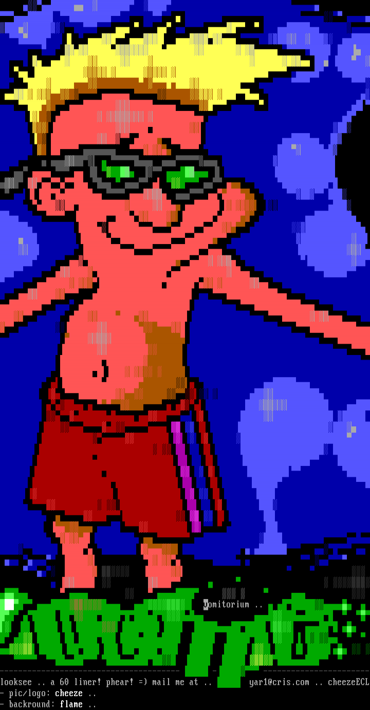 vomitorium .. --------------------------------------- - -----------------------looksee .. a 60 liner! phear! mail me at .. yar1@cris.com .. cheezeECL- pic/logo: cheeze ..