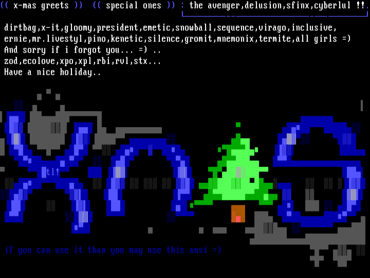 x-mas greets special ones : the avenger,delusion,sfinx,cyberlul !!. ------ dirtbag,x-it,gloomy,president,emetic,snowball,sequence,virago,inclusive,