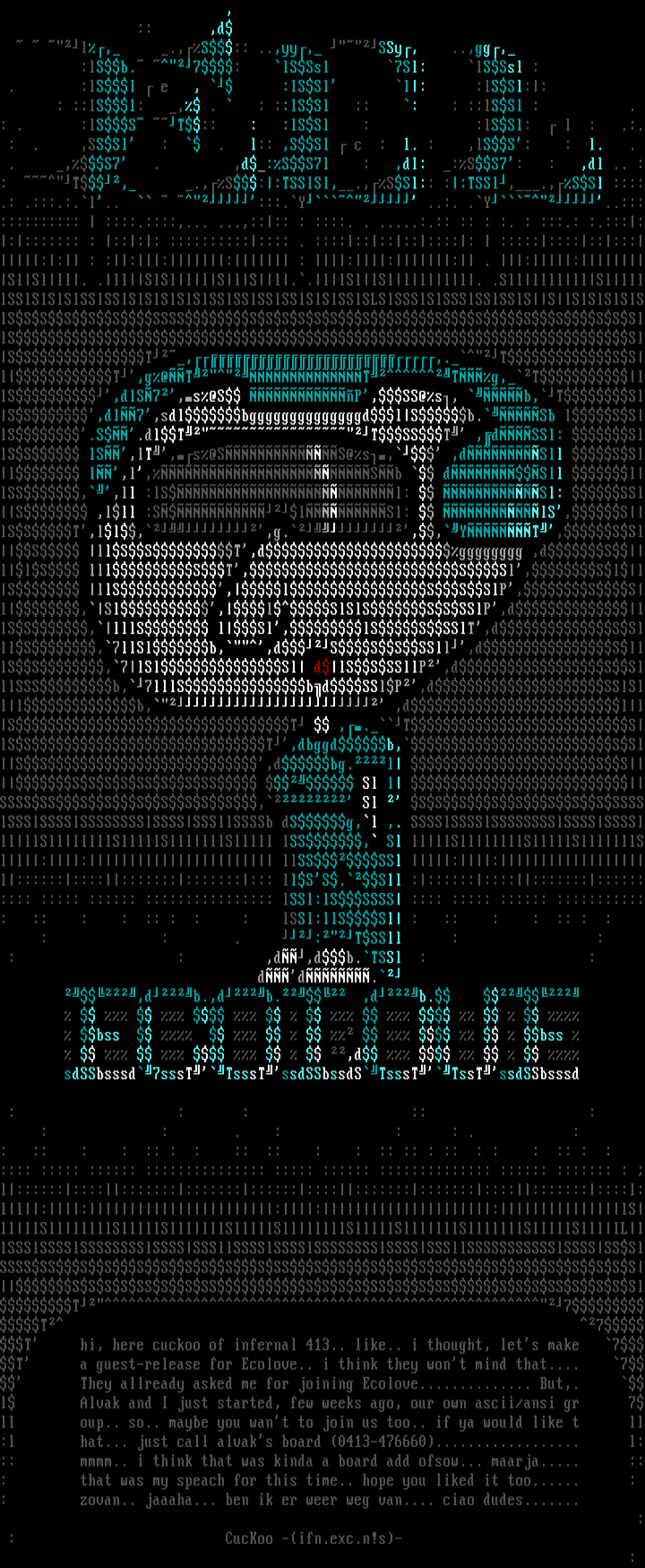 :::: ::::: :::::: ::::::::::::::: ::::: :::::: :::::::::::::: :::::: ::::::: : l:::::::::::::::::::::::::::::::::::::::::::::::::::::::::::::::l:ll:::::lSllllSlllllllSlllllSllllllSlllllSlllllllSlllllSllllllSlllllllSlllllSllllLllSSSlSSSSlSSSSSSSSlSSSSSSSllSSSSlSSSSlSSSSSSSSlSSSSSSSllSSSSSSSSSSSlSSSSSSSlSSSSSSSSSSSSSSSSSSSSSSSSSSSSSSSSSSSSSSSSSSSSSSSSSSSSSSSSSSSlT7T 7T hi, here cuckoo of infernal 413.. like.. i thought, lets make 7T a guest-release for Ecolove.. i think they wont mind that.... 7 They allready asked me for joining Ecolove.............. But,. l Alvak and I just started, few weeks ago, our own ascii/ansi gr 7ll oup.. so.. maybe you want to join us too.. if ya would like t ll:l hat... just call alvaks board 0413-476660.................. l::: mmmm.. i think that was kinda a board add ofsow... maarja..... ::: that was my speach for this time.. hope you liked it too...... :