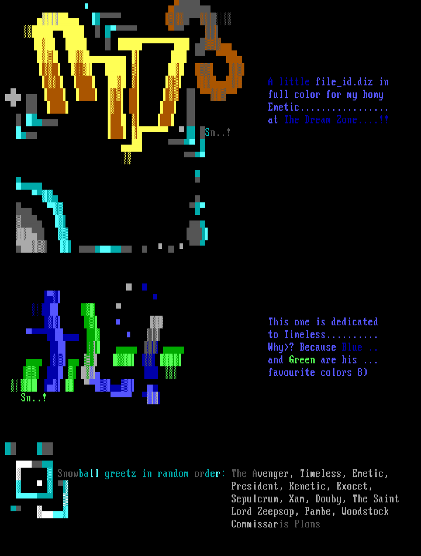 Snowball greetz in random order: The Avenger, Timeless, Emetic,