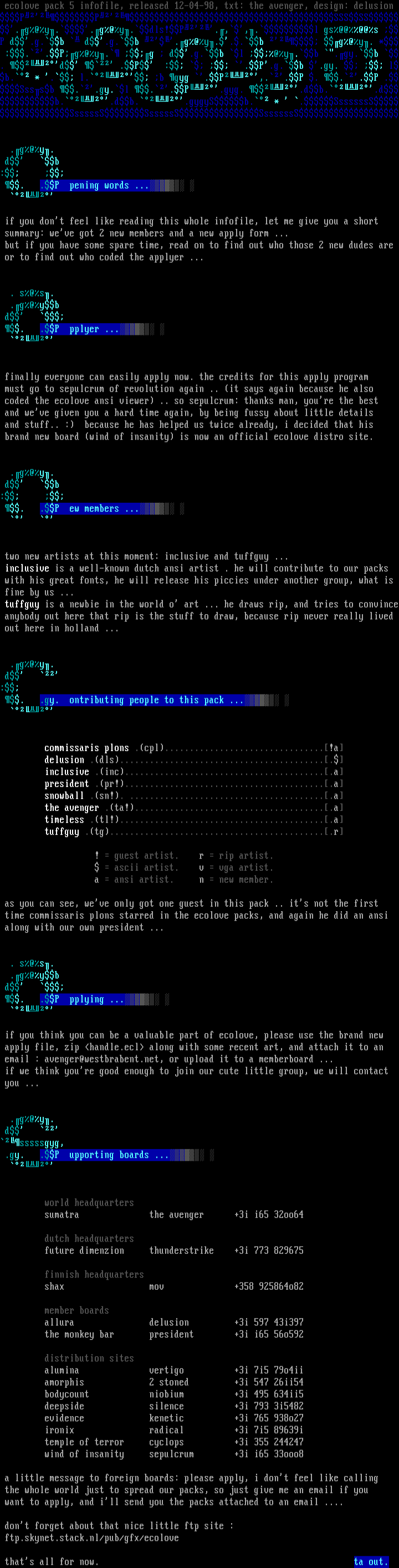 ecolove pack 5 infofile, released 12-04-98, txt: the avenger, design: delusion