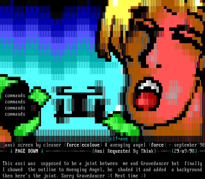 commands commands commands commands cl!+ave ansi screen by cleaner forceecolove avenging angel force - september98 PAGE DOWN Ansi Requested By Think29/o9/98