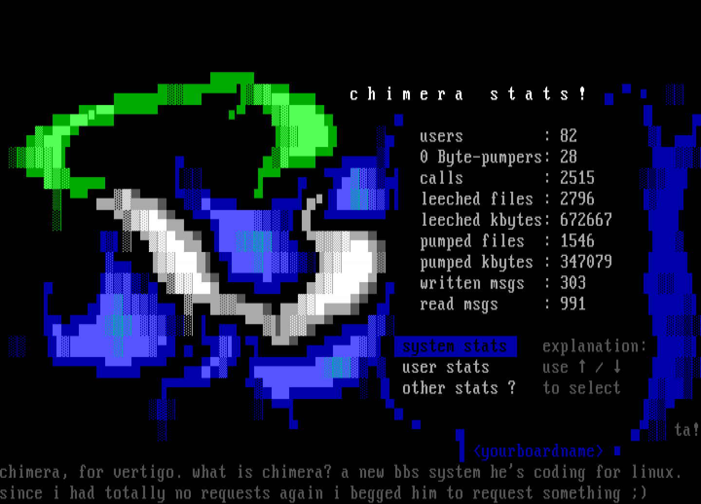 chimera, for vertigo. what is chimera? a new bbs system hes coding for linux.