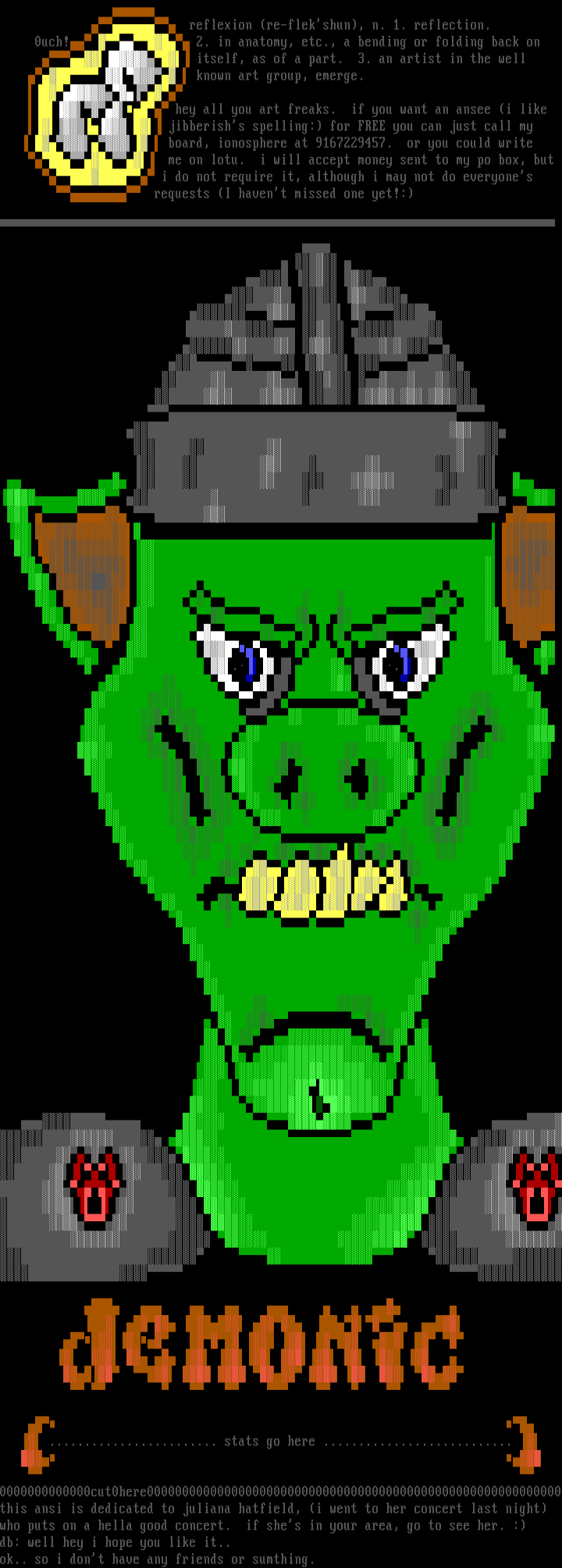 ........................ stats go here ........................... 0000000000000cut0here00000000000000000000000000000000000000000000000000000000000this ansi is dedicated to juliana hatfield, i went to her concert last night