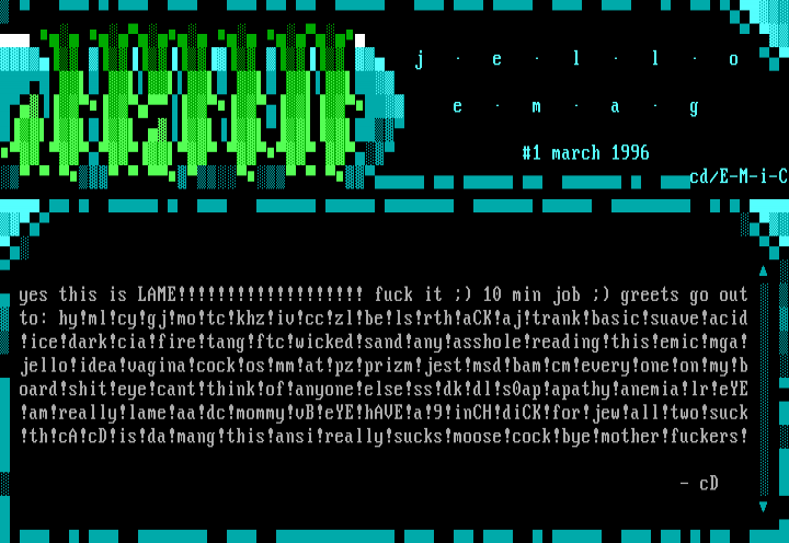 !th!cA!cD!is!da!mang!this!ansi!really!sucks!moose!cock!bye!mother!fuckers!