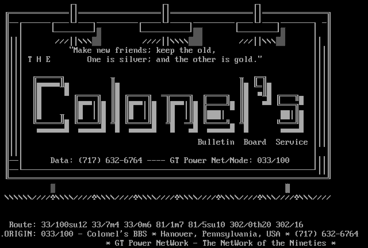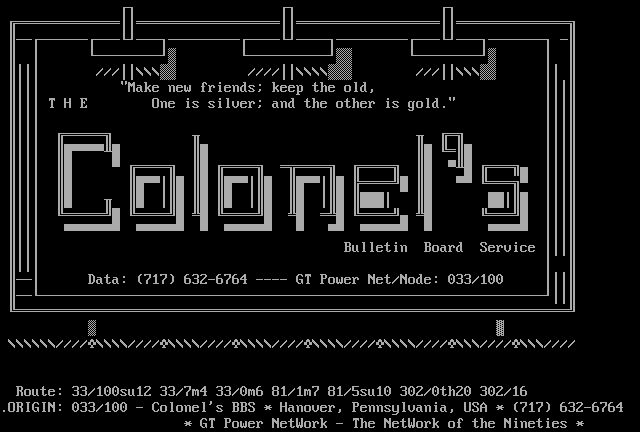.ORIGIN: 033/100 - Colonels BBS * Hanover, Pennsylvania, USA * 717 632-6764 * GT Power NetWork - The NetWork of the Nineties *