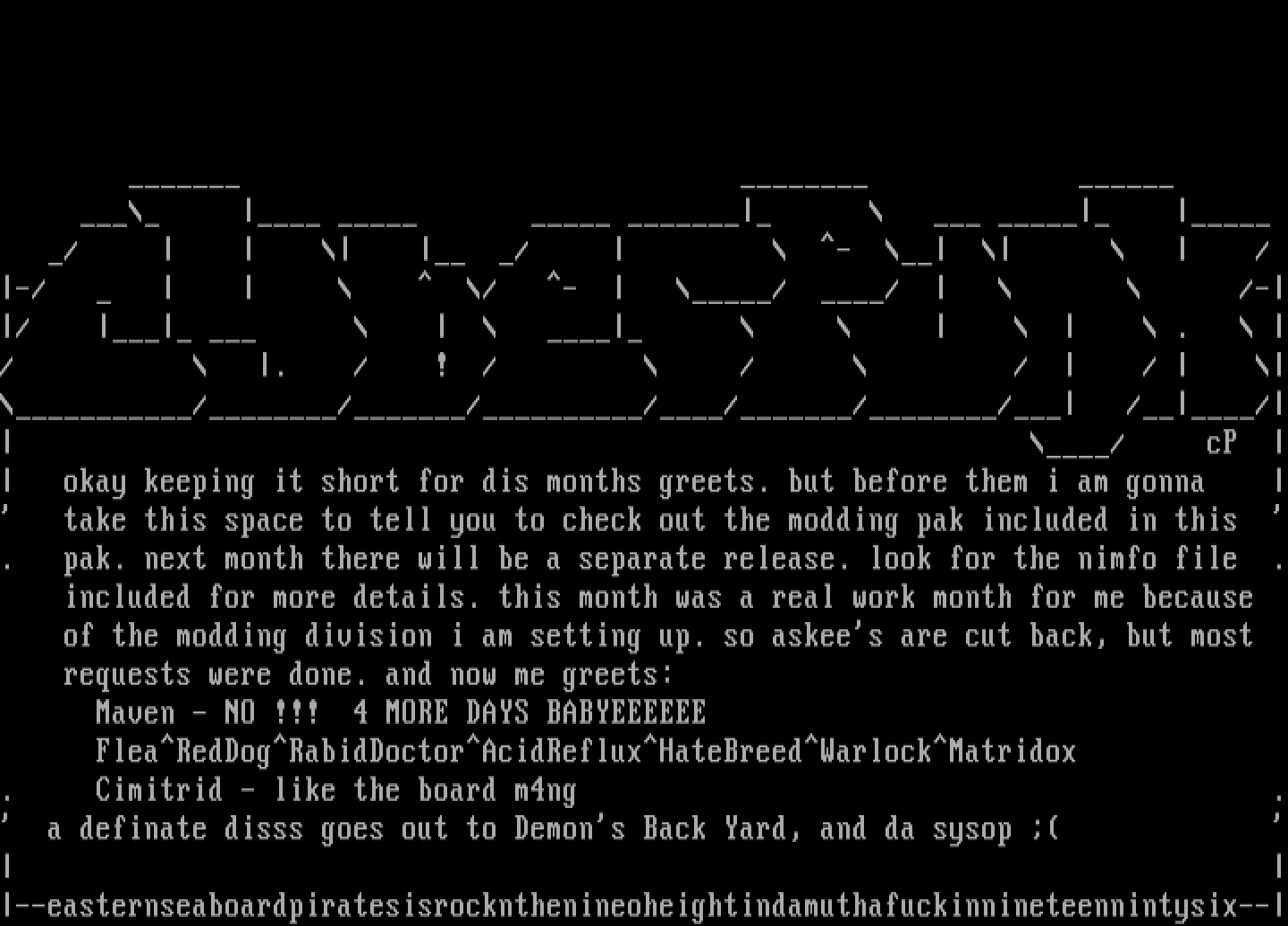 -/ / - / / /-/ . / . / ! / / / / // / cP okay keeping it short for dis months greets. but before them i am gonna take this space to tell you to check out the modding pak included in this . pak. next month there will be a separate release. look for the nimfo file . included for more details. this month was a real work month for me because