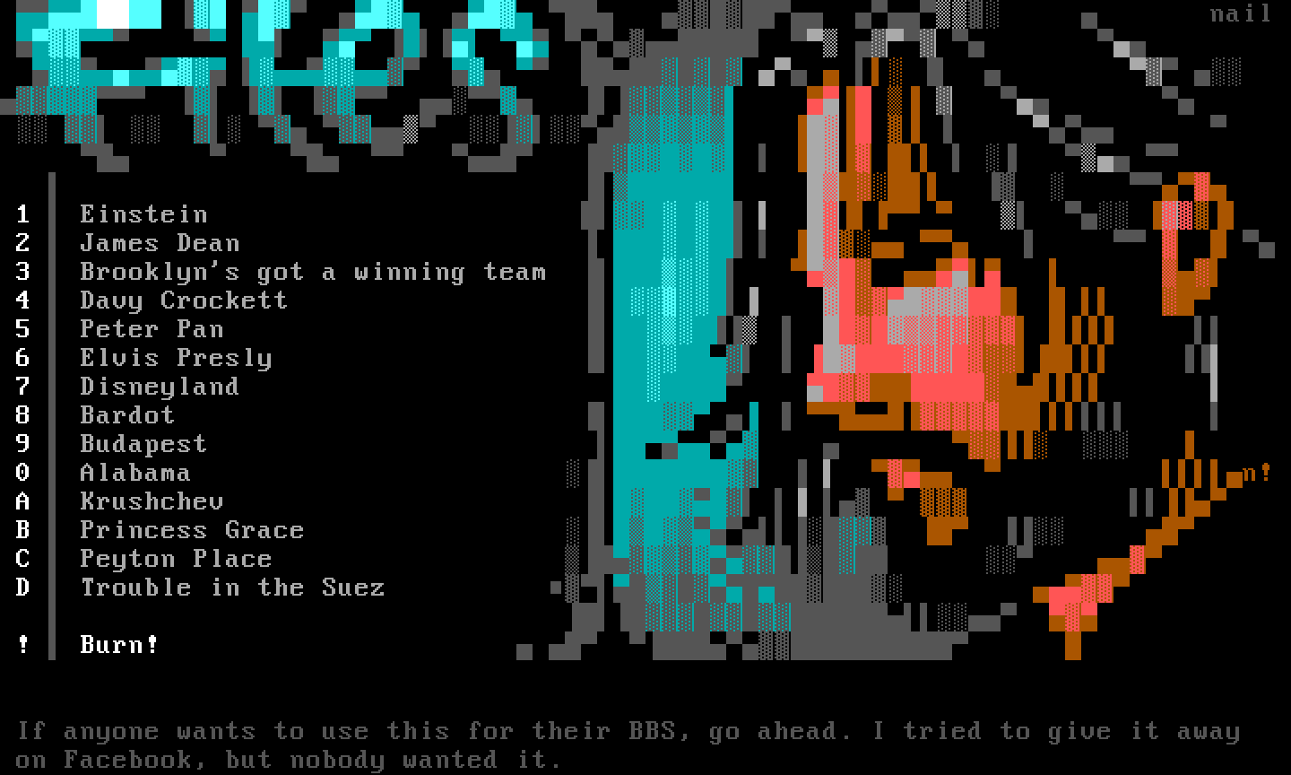 If anyone wants to use this for their BBS, go ahead. I tried to give it away