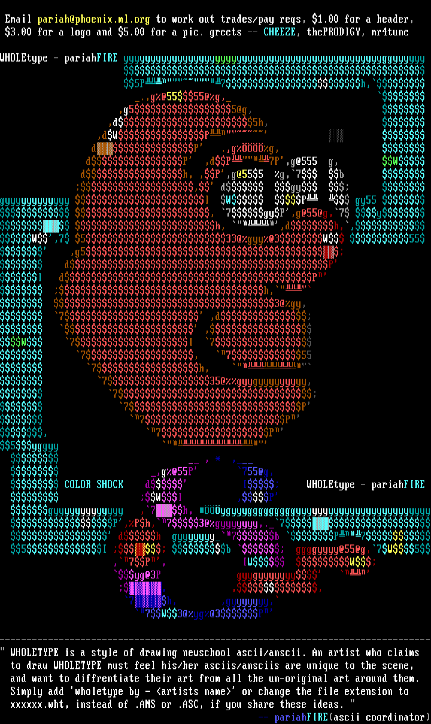 -------------------------------------------------------------------------------- WHOLETYPE is a style of drawing newschool ascii/anscii. An artist who claims to draw WHOLETYPE must feel his/her asciis/ansciis are unique to the scene, and want to diffrentiate their art from all the un-original art around them. Simply add wholetype by - artists name or change the file extension to xxxxxx.wht, instead of .ANS or .ASC, if you share these ideas.