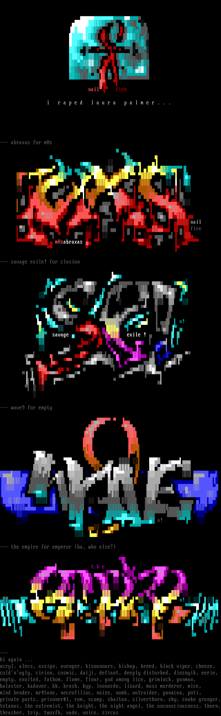 private parts, prisoner1, rom, scamp, shaitan, silverthorn, sky, snake grunger,tetanus, the extremist, the knight, the night angel, the unconsciousness, thorn,thrasher, trip, twoxfh, vade, voice, zircus