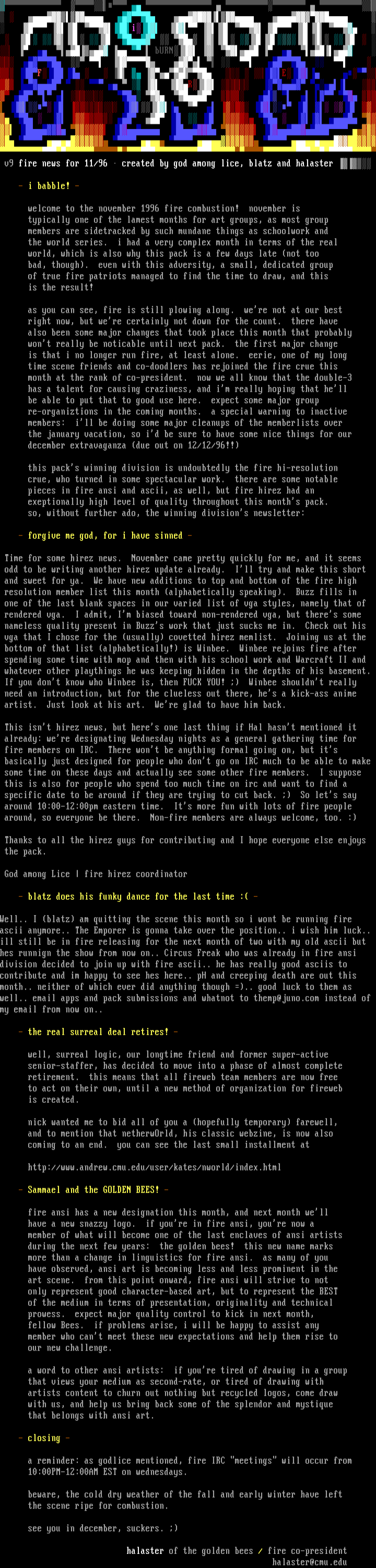 v9 fire news for 11/96 created by god among lice, blatz and halaster