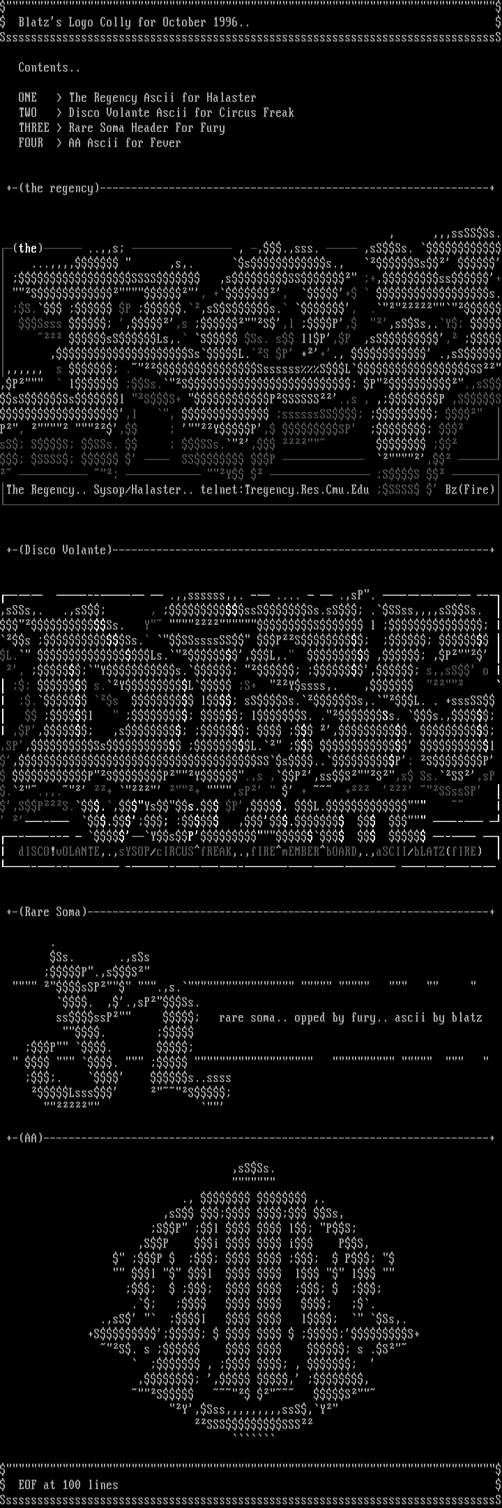 Blatzs Logo Colly for October 1996.. SssssssssssssssssssssssssssssssssssssssssssssssssssssssssssssssssssssssssssssssS Contents.. ONE The Regency Ascii for Halaster TWO Disco Volante Ascii for Circus Freak THREE Rare Soma Header For Fury FOUR AA Ascii for Fever
