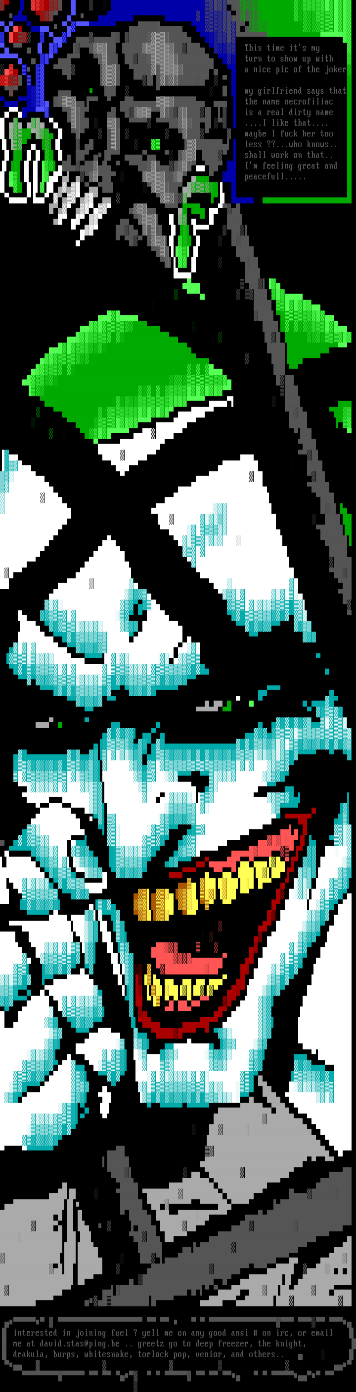 interested in joining fuel ? yell me on any good ansi on irc, or email me at david.stas@ping.be .. greetz go to deep freezer, the knight, drakula, burps, whitesnake, torlock pop, venior, and others..