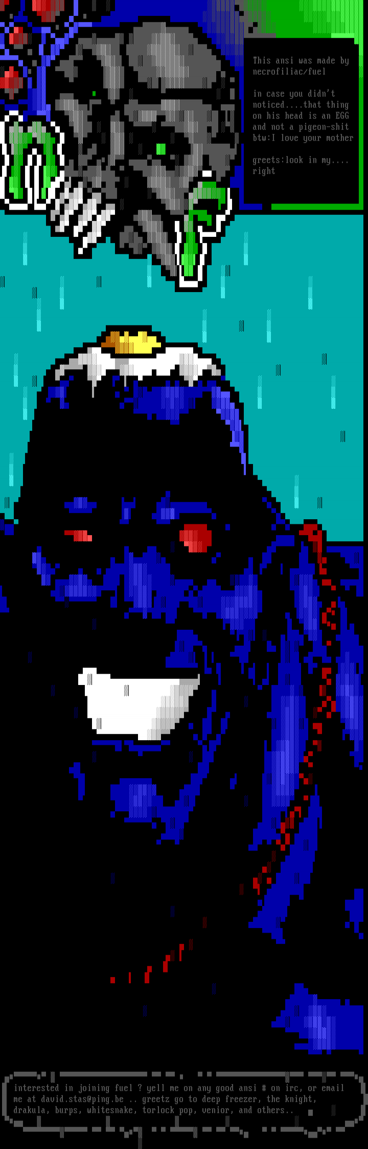 interested in joining fuel ? yell me on any good ansi on irc, or email me at david.stas@ping.be .. greetz go to deep freezer, the knight, drakula, burps, whitesnake, torlock pop, venior, and others..